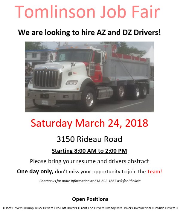 Tomlinson Pa Twitter Az Or Dz Drivers Looking For Work Join Us For Our Job Fair On March 24th 8 00am 2 00pm At 3150 Rideau Rd Open Positions Float Drivers Dump Truck Drivers Front